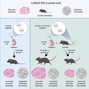24 Februar 2026Dual AAV gene therapy using laminin-linking proteins ameliorates muscle and nerve defects in LAMA2-related muscular dystrophy.